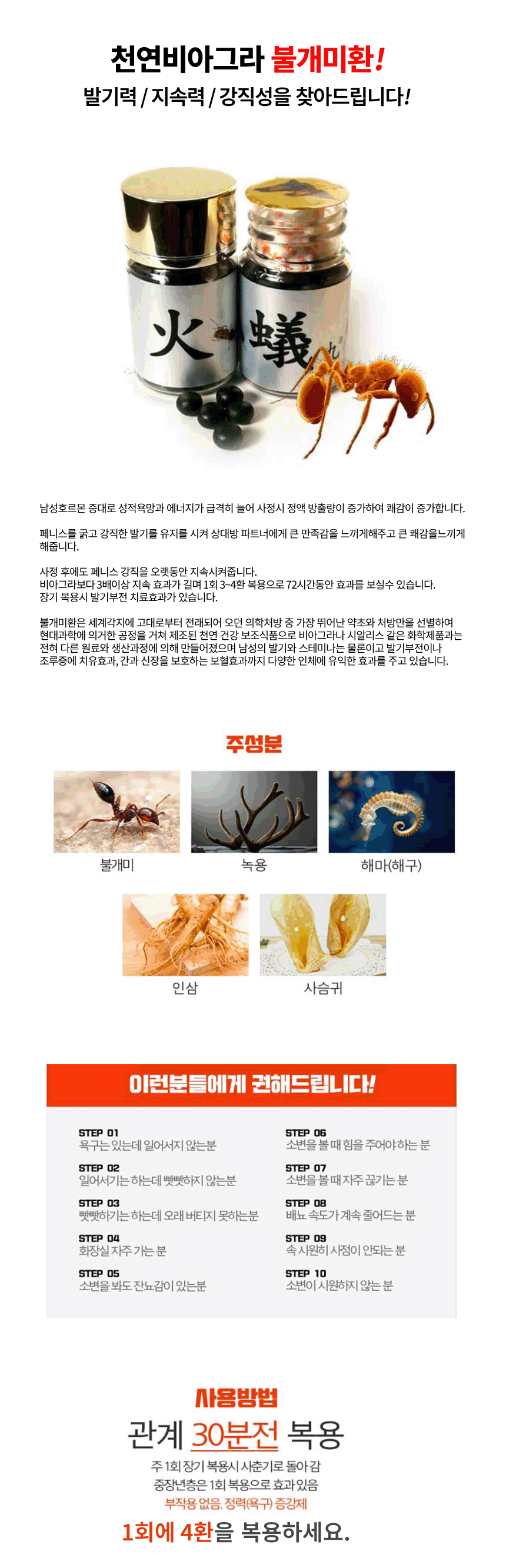 정력이 예전같지아니하여 인터넷을 검섹하여 수술을 할까 고민도햇습니다 그러던중 알게되어습니다.처음엔 의심도 햇는데 한알 먹어보고 놀랏읍니다 내나이오십대 이럴수가? 이십대 청춘을 되찾은거같네요